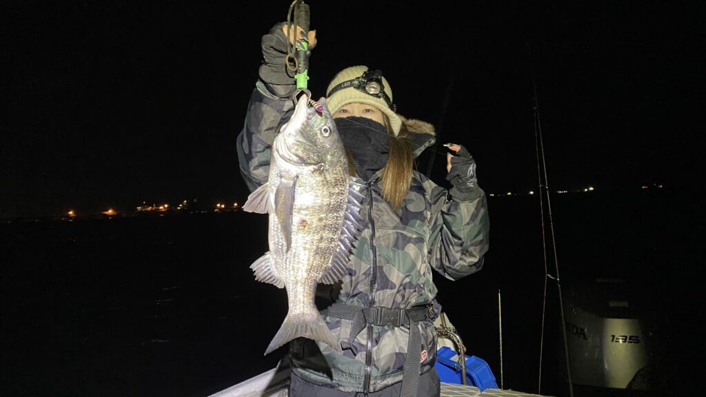 この日はナイトのクロダイキャスティング便で出船。風も弱く、夜の雰囲気は良好。潮も程よく効いていて、いかにも釣れそうな状況でした。ポイントに入ると、ボトム付近に反応あり。ただし簡単には口を使わず、しっかりコースとレンジを通さないと食わないテクニカルな展開。アタリはあるものの乗らない場面もあり、丁寧な操作が求められる一日でした。
